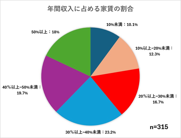 家賃は、一般的には手取り額の25%~30%ほどが目安と言われています。今回のアンケート結果では、60%以上の方が年間収入に占める家賃の割合が30%以上と回答されました。家賃が手取り額の30%を超える場合、可処分所得(自由に使えるお金)が減り、子どもの養育に使うことができる費用も制限され、そして貯蓄・将来資金の確保が難しくなることが想定されます。また経済的不安が常態化することにより、日常の生活における精神的ストレスの増加が考えられます。