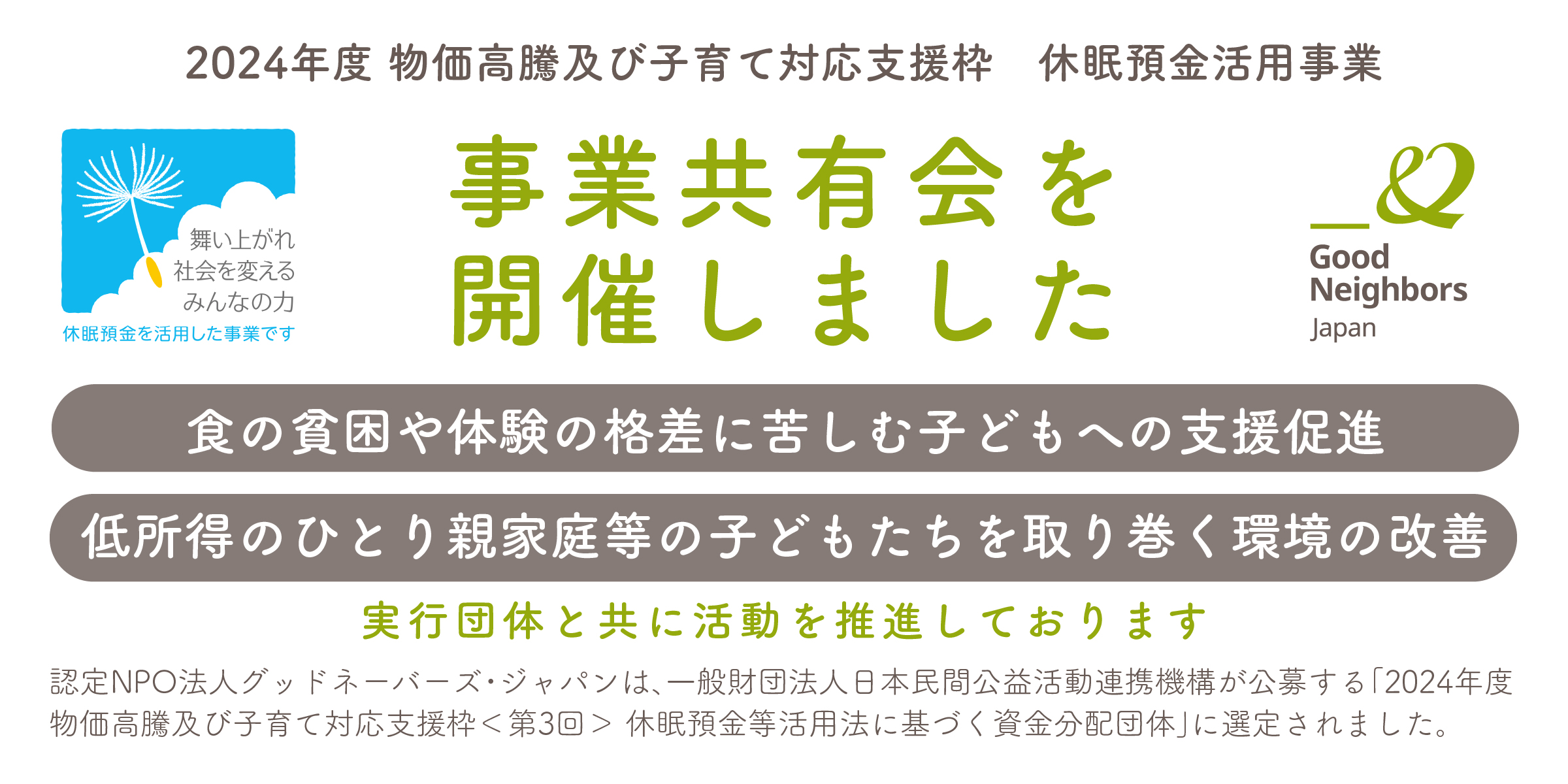この状況を受け、グッドネーバーズ・ジャパンは、一般財団法人日本民間公益活動連携機構(所在地:東京都千代田区、理事長:二宮 雅也、英文名:Japan Network for Public Interest Activities、略称:JANPIA)の「2024年度 物価高騰及び子育て対応支援枠<第3回> 休眠預金等活用法に基づく資金分配団体」として、子どもの「食」や「体験」に関する課題を抱えた低所得のひとり親家庭等を支援する団体に対し資金的・非資金的サポートを行い、支援活動の促進に取り組んでいます。