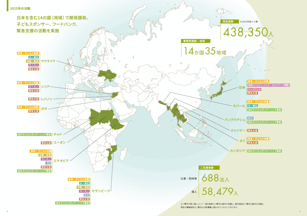 本報告書では、国内事業、子どもスポンサー事業、海外の緊急・開発支援のそれぞれについて、活動を展開した国や地域ごとに、現場スタッフや支援を受けた方々の生の声とともにお届けしています。