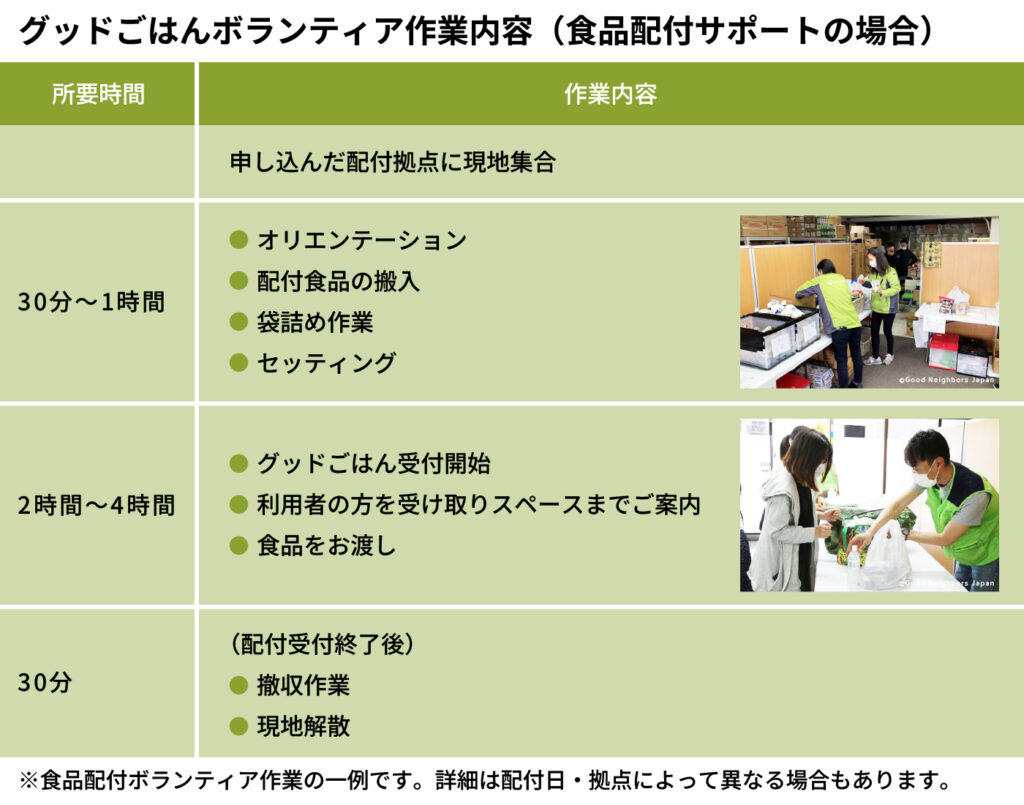 食品配付の受付・配付サポート![]() | 各日 10:00~19:00内で応相談(詳細はカレンダーで毎月の活動予定をご確認ください) 定員:1~5名/日 場所:グッドごはんの配付拠点(東京・神奈川) 服装・持ち物:動きやすい服装、飲み物、軍手 ※月に1回以上、長期間(半年以上)続けてご協力いただける方歓迎 |