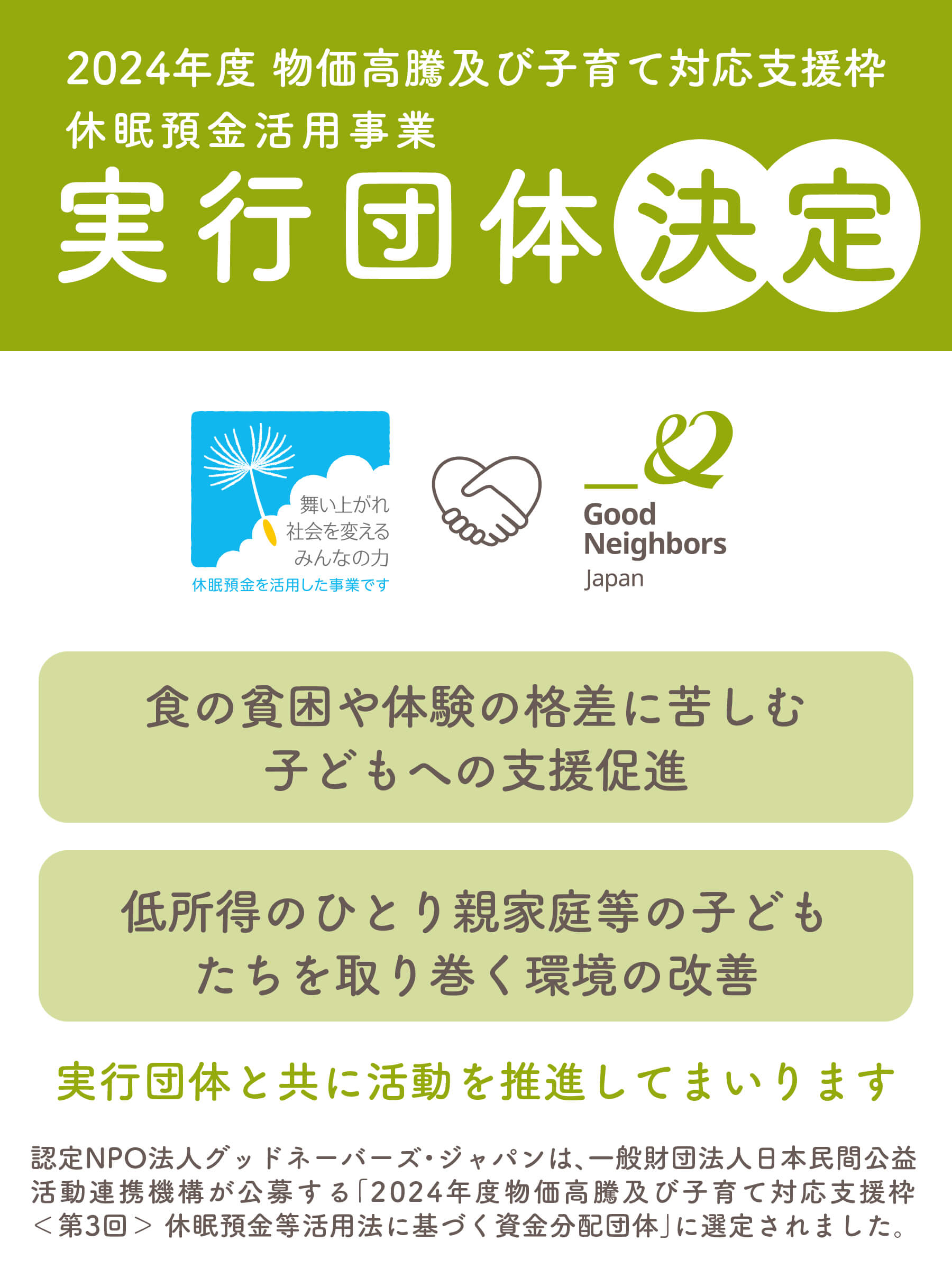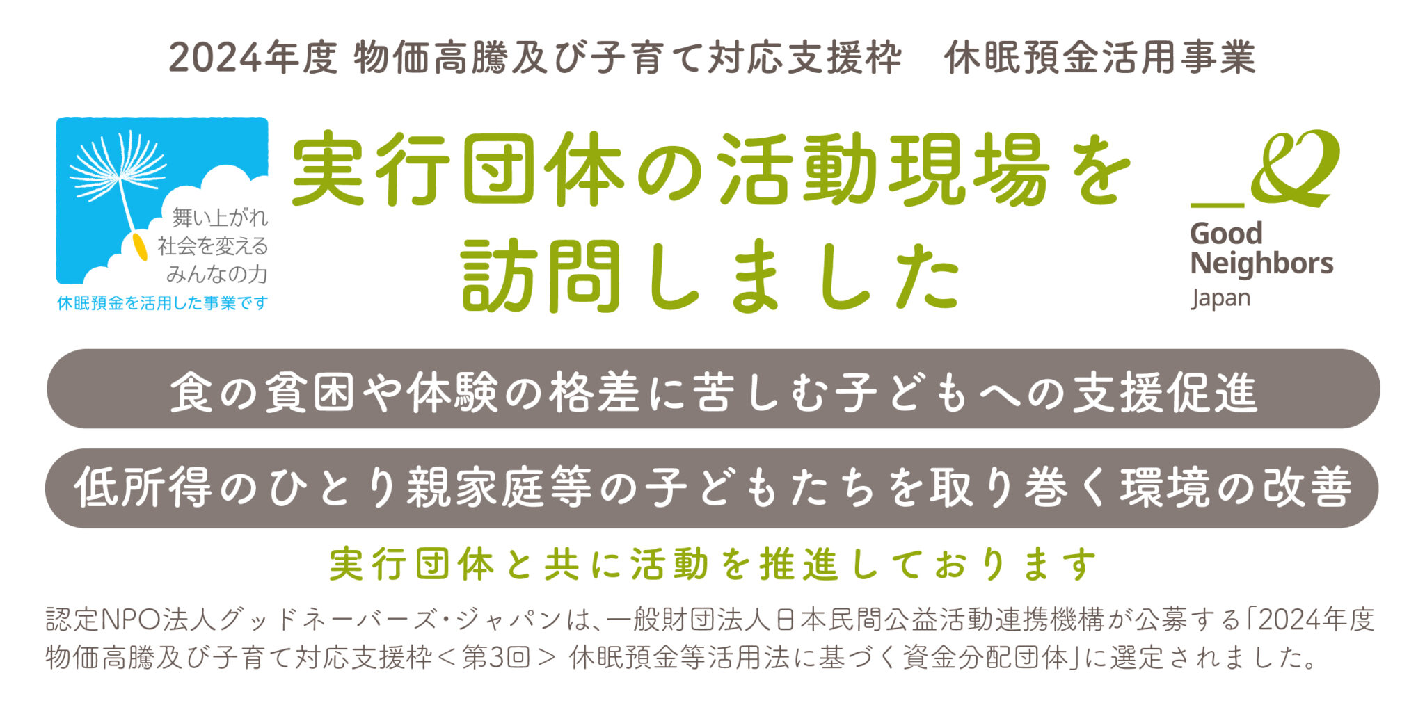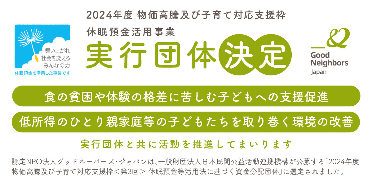 認定NPO法人グッドネーバーズ・ジャパン(本部:東京都大田区、代表理事:小泉 智)は、一般財団法人日本民間公益活動連携機構(所在地:東京都千代田区、理事長:二宮 雅也、英文名:Japan Network for Public Interest Activities、略称:JANPIA)が公募する「2024年度 物価高騰及び子育て対応支援枠<第3回> 休眠預金等活用法に基づく資金分配団体」に選定されました。